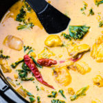 - Place all the ingredients, except for the coconut milk, garnish and kale, into your crockpot and stir together well. Set your crockpot to cook on high for 4 hours.