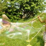 - Giant bubbles can be made with three strings attached to 2 wands like this https://rhubarbandwren.co.uk/giant-bubble-wand-tutorial/