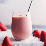- In a blender, dump in the 2 juices, then add the frozen yogurt and top with frozen strawberries.